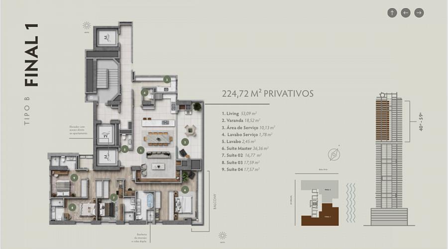 - 131 Apartamentos: 8 Tipologias com 4 suites de 171m² a 225m² Privativos e ate 4 vagas de garagem