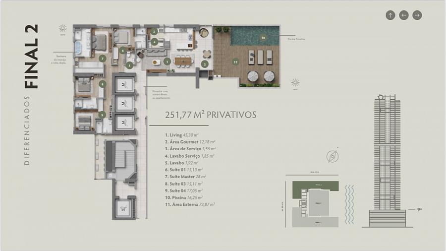 - 131 Apartamentos: 8 Tipologias com 4 suites de 171m² a 225m² Privativos e ate 4 vagas de garagem