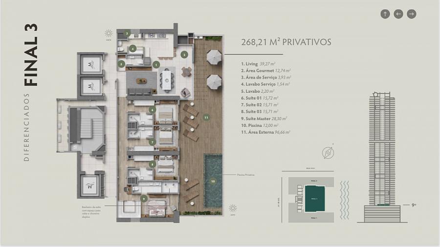 - Tipos Diferenciados: 9º andar, acima do lazer, com piscina Privativa